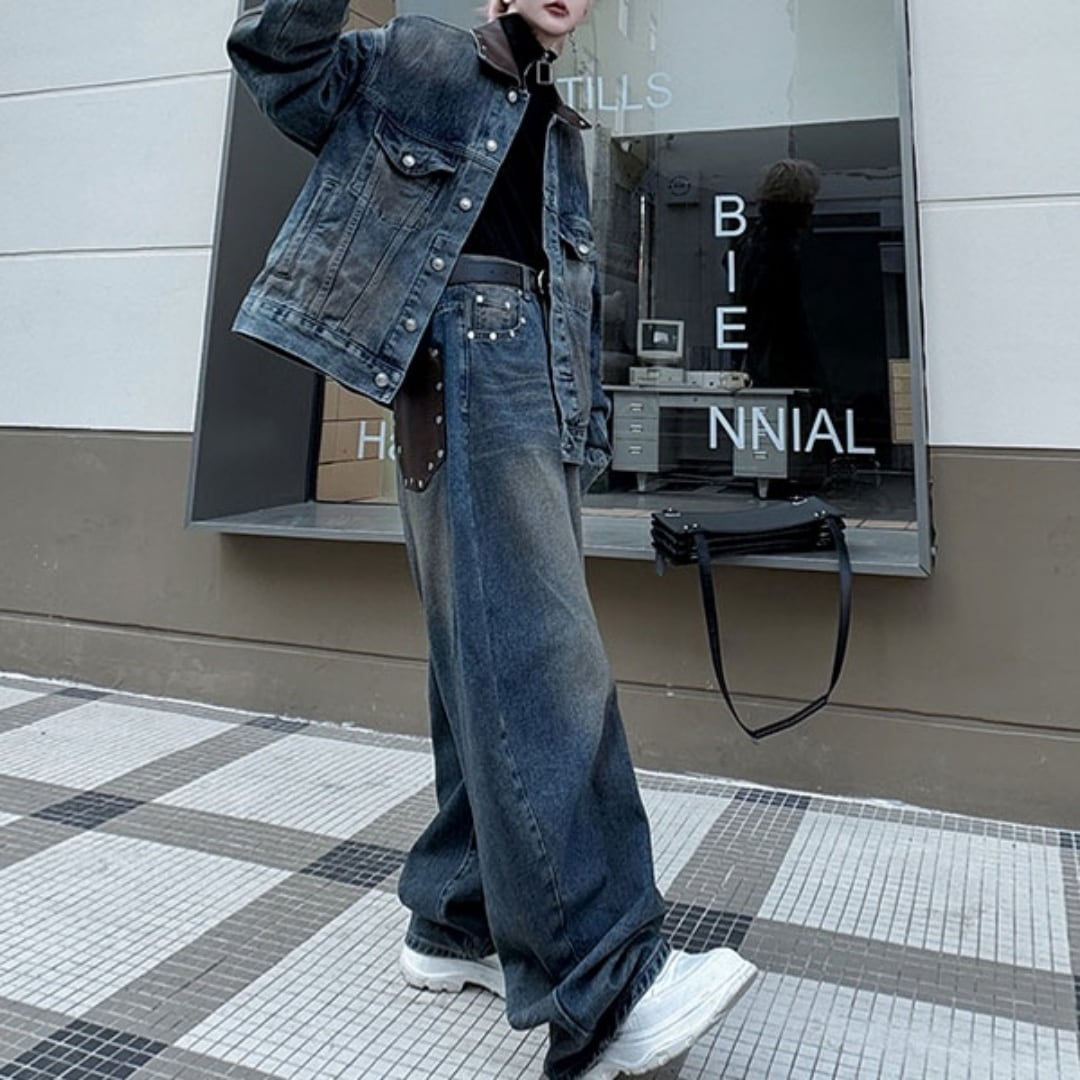 ヴィンテージ風ウォッシュ PUレザー切替 デニムセットアップ D11420