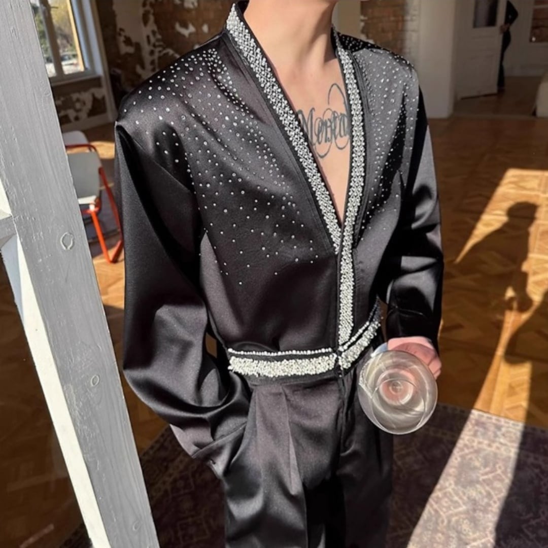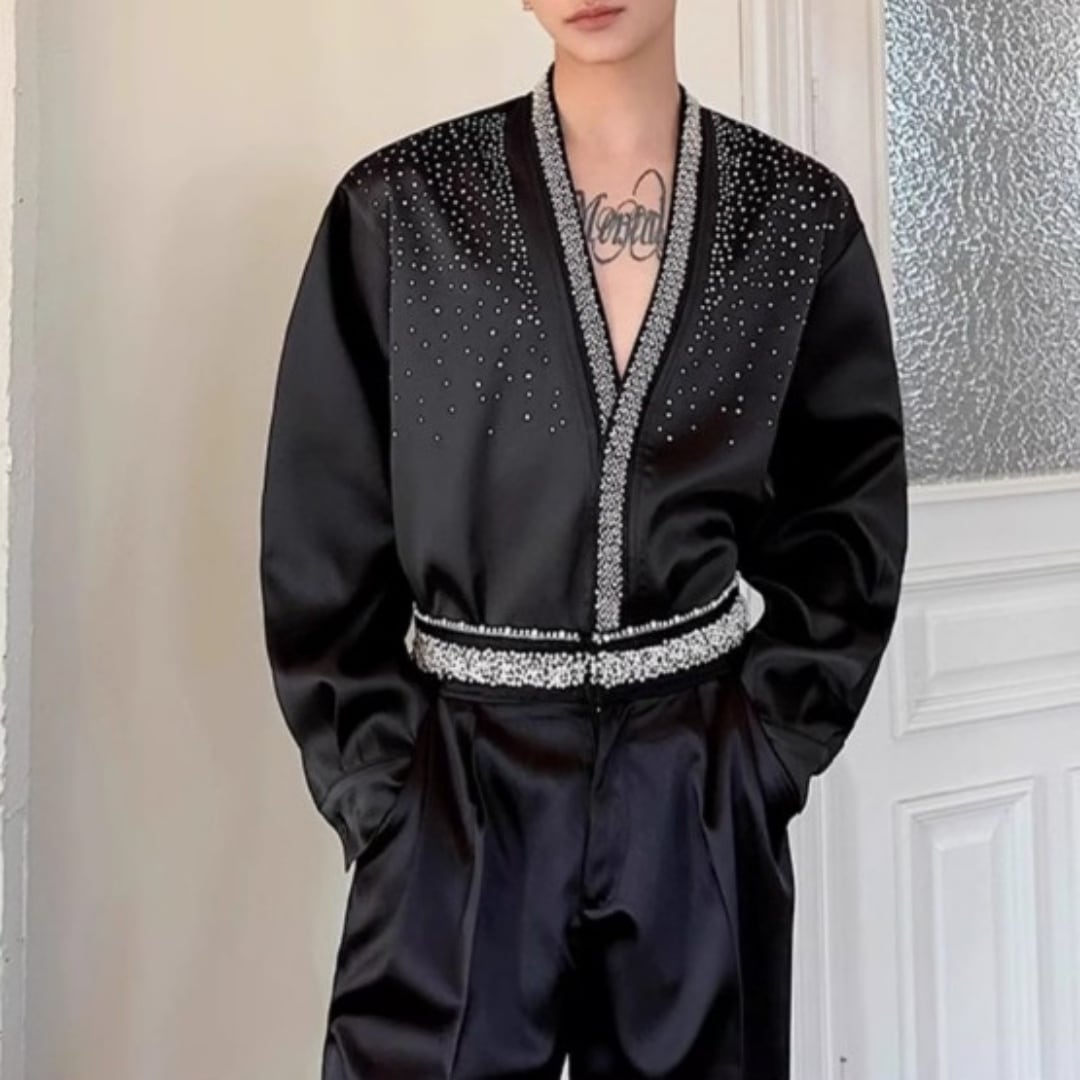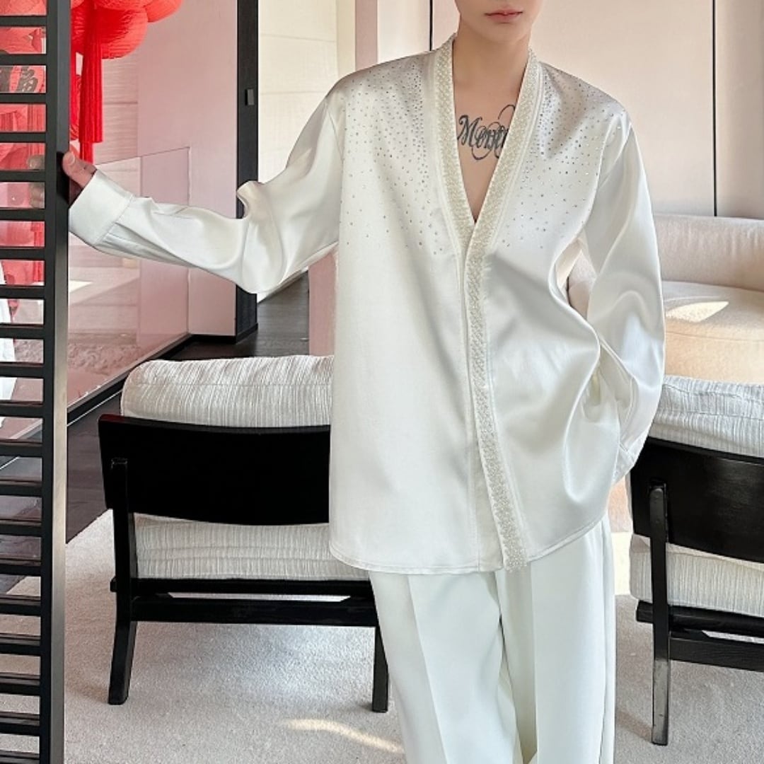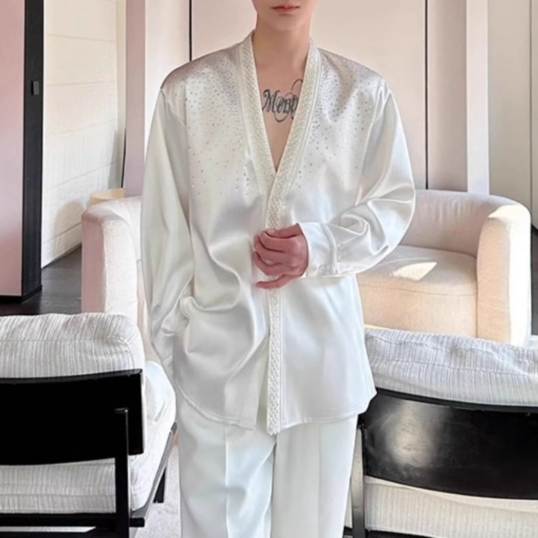 ビジュー装飾 Vネックシャイニーシャツ 2カラー D11479